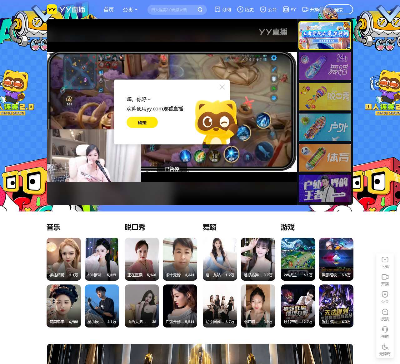 YY致力于打造全民娱乐的互动直播平台,以多样的美女互动、优质的直播内容、极致的互动体验,满足用户音乐、舞蹈、户外等直播及绝地求生、王者荣耀等热门游戏直播的观看需求。