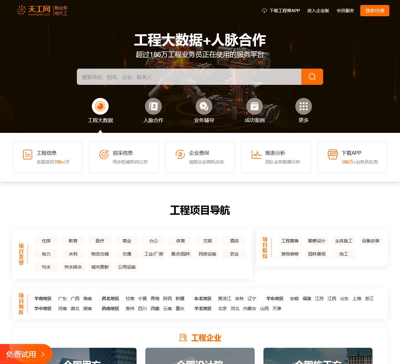 跑项目上天工网工程帮,天工网致力于工程销售的研究,赋能销售快速获得有效的工程业务线索,提供全国在建项目和拟在建工程信息,线下人脉对接活动,合作交流群等服务,依托互联网引领行业新变革!