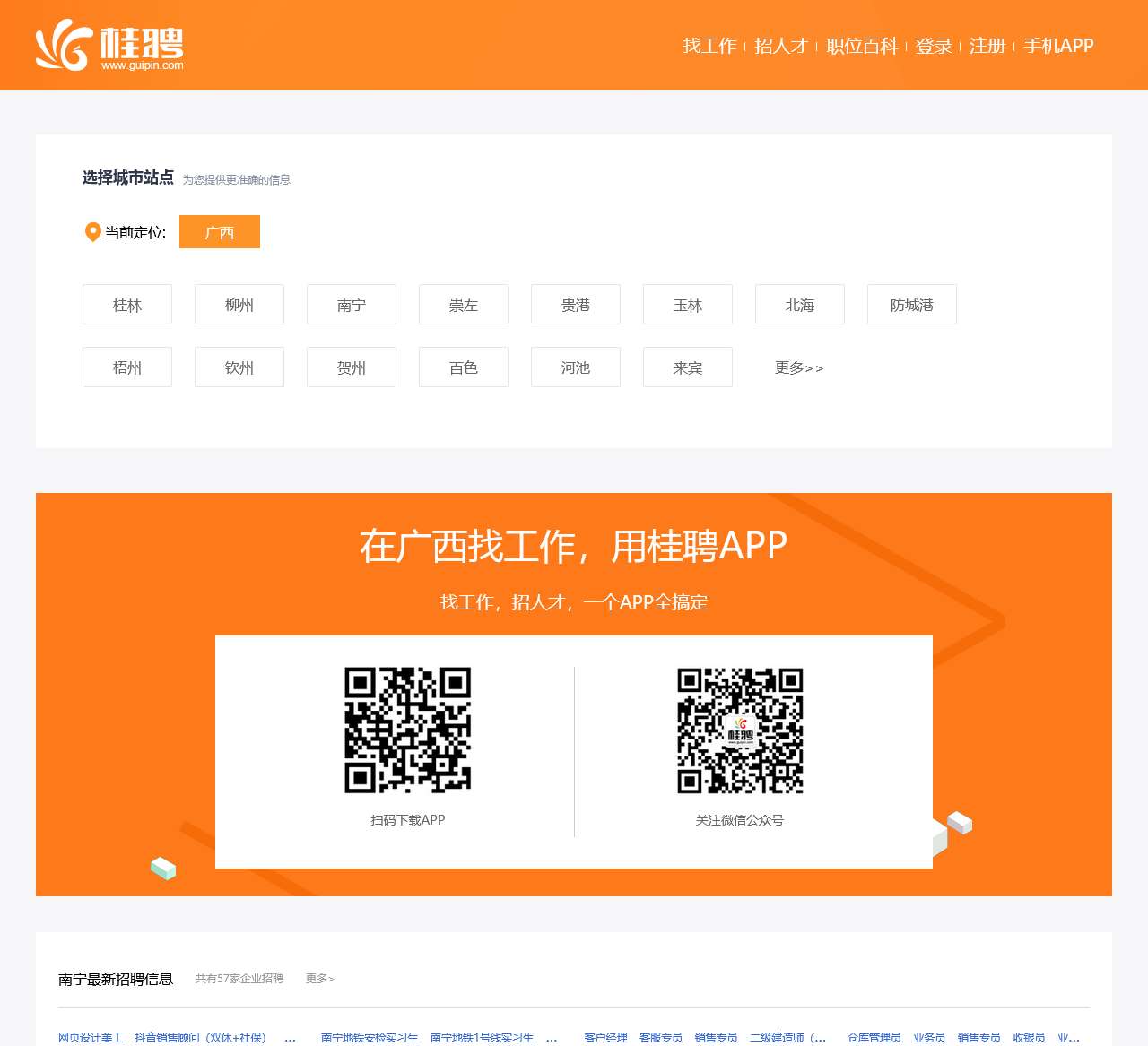 该网站提供了简洁明了的导航,让用户能够轻松找到所需信息。首页的内容包括:找工作、招人才、职位百科、登录、注册、手机APP以及广西、桂林、柳州、南宁等城市的链接。