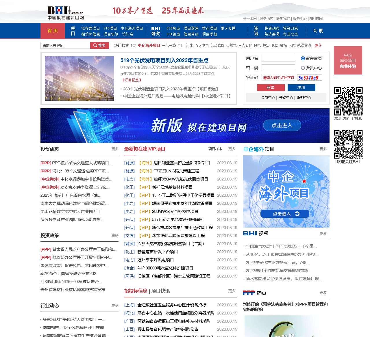 BHI中国拟在建项目网是国内首家发布拟在建项目信息的网站,为客户提供网上信息查询、网下信息推送以及个性化专项咨询服务。在线可查询:拟在建项目、VIP项目、招标、中标、国家重点项目、各地区重点、投资规划、项目聚焦、投资建设动态、投资政策、BHI视点等;网下信息推送服务包括信息简报、行业专刊、项目季报、项目反查、关键词订阅等服务;个性化专项咨询为客户提供按需订制的项目筛选汇总、跟踪调研、分析研究等服务方案。