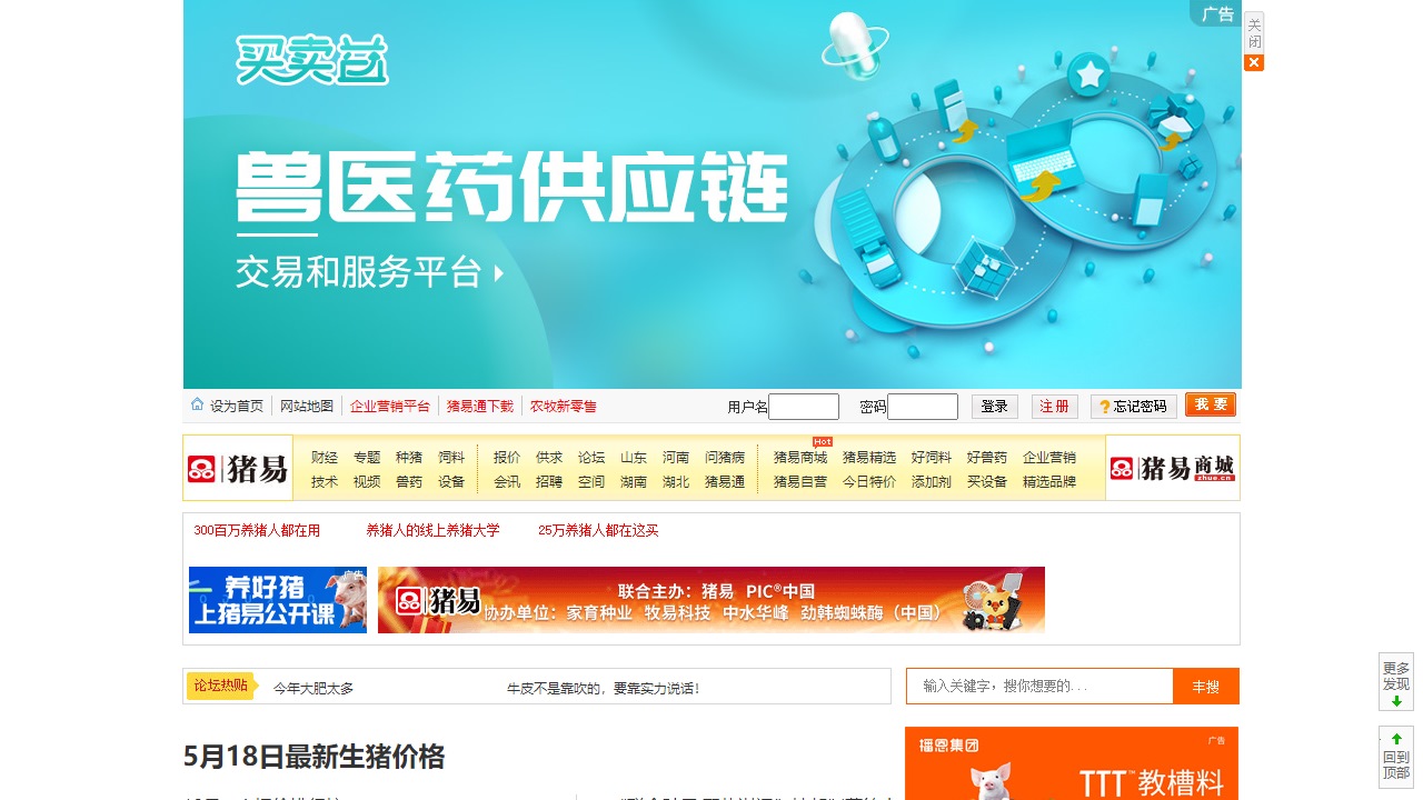 猪易网是集养猪财经、技术、生猪价格行情、猪病问答、社区论坛、畜牧商城为一体,涵盖种猪、兽药、器械、饲料的养猪行业综合门户网站,成立于2000年,致力为养猪人服务。我们的宗旨是:让养猪更简单,更高效,更快乐。