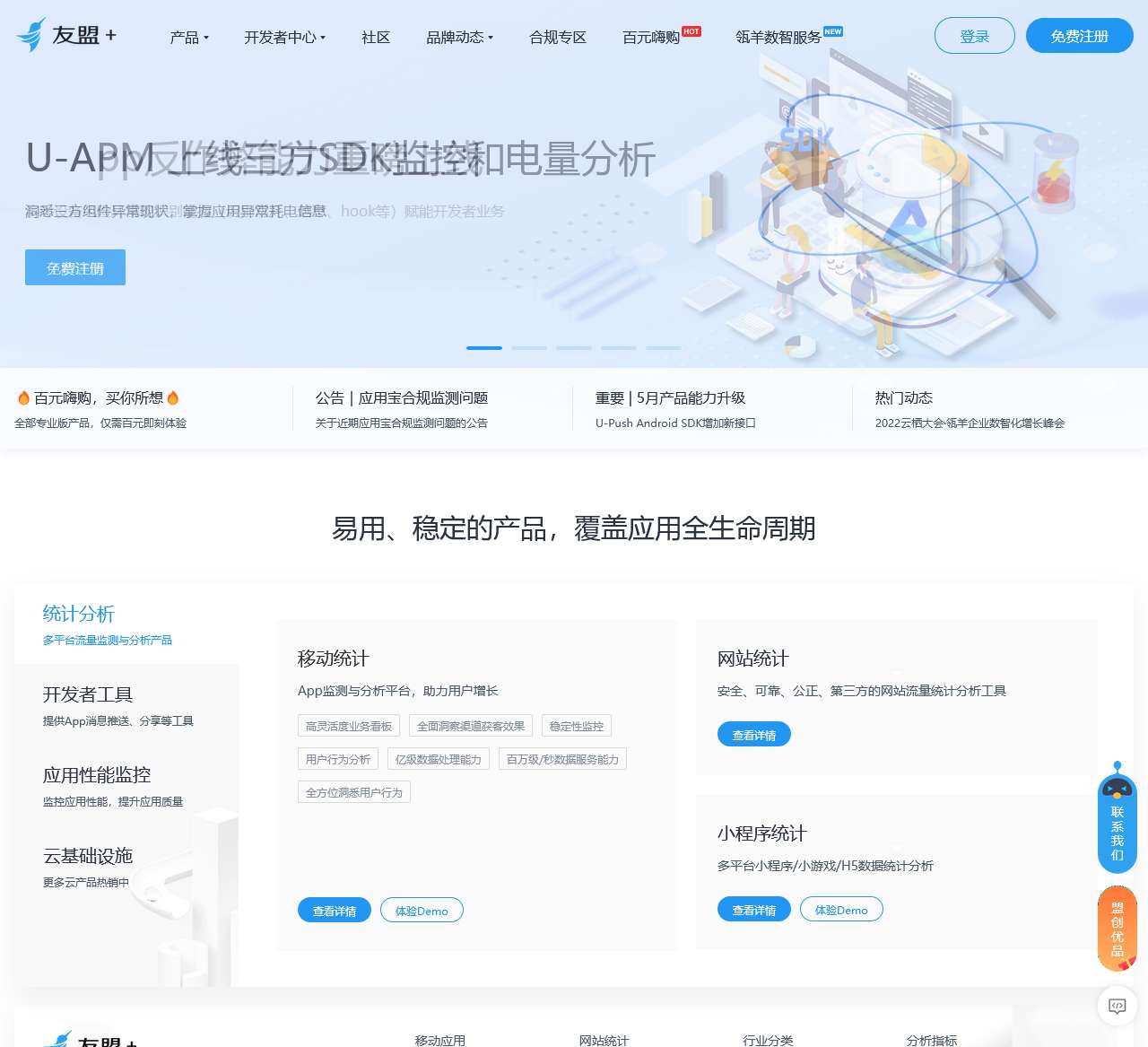 友盟开发者社区是一个致力于提供全面的统计分析、开发者工具、应用性能监控和云基础设施的平台。通过友盟开发者社区,您可以获得以下相关产品和服务: