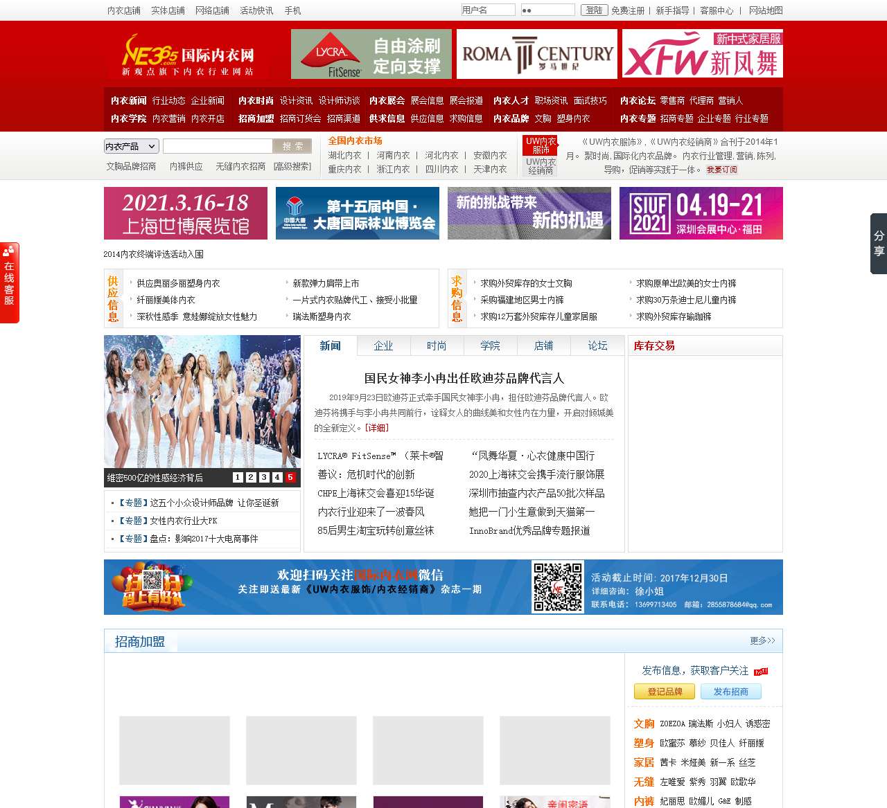 国际内衣网(知名)最具影响力的内衣网站。主要服务于内衣品牌商、内衣生产商、内衣面辅料商等,提供内衣加盟、内衣代理、内衣供求,是内衣公司获取商机、资讯、人才的最佳平台。