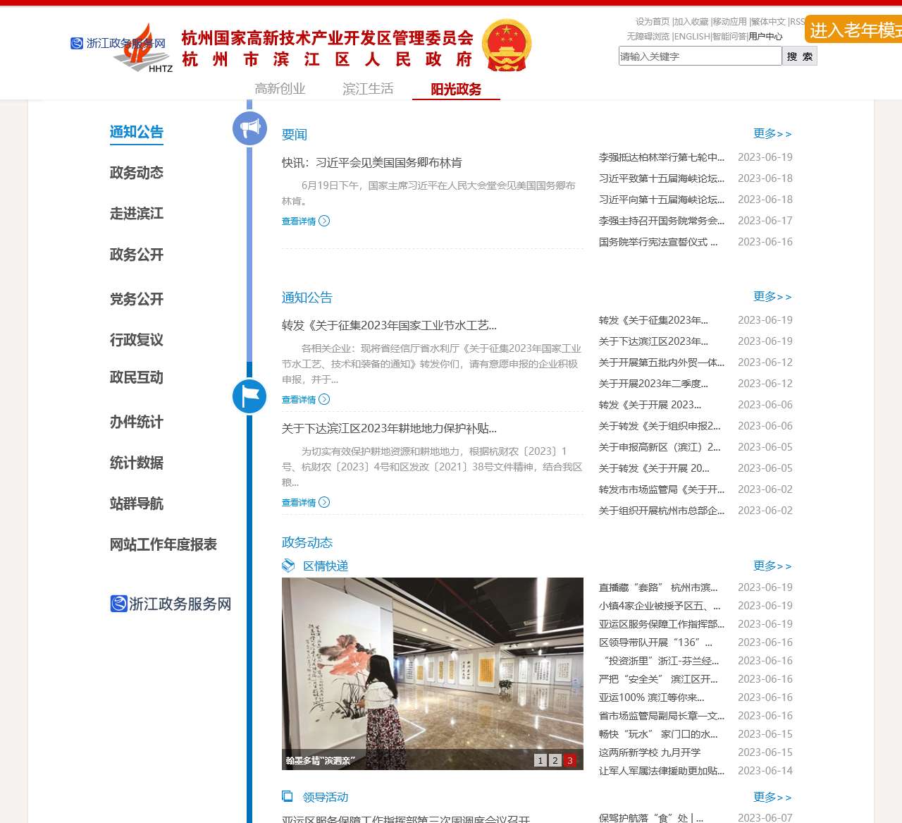 | 政务动态 | 主要报道区内政务信息,包括区情快递、领导活动、图片新闻和滨江发布等。 |