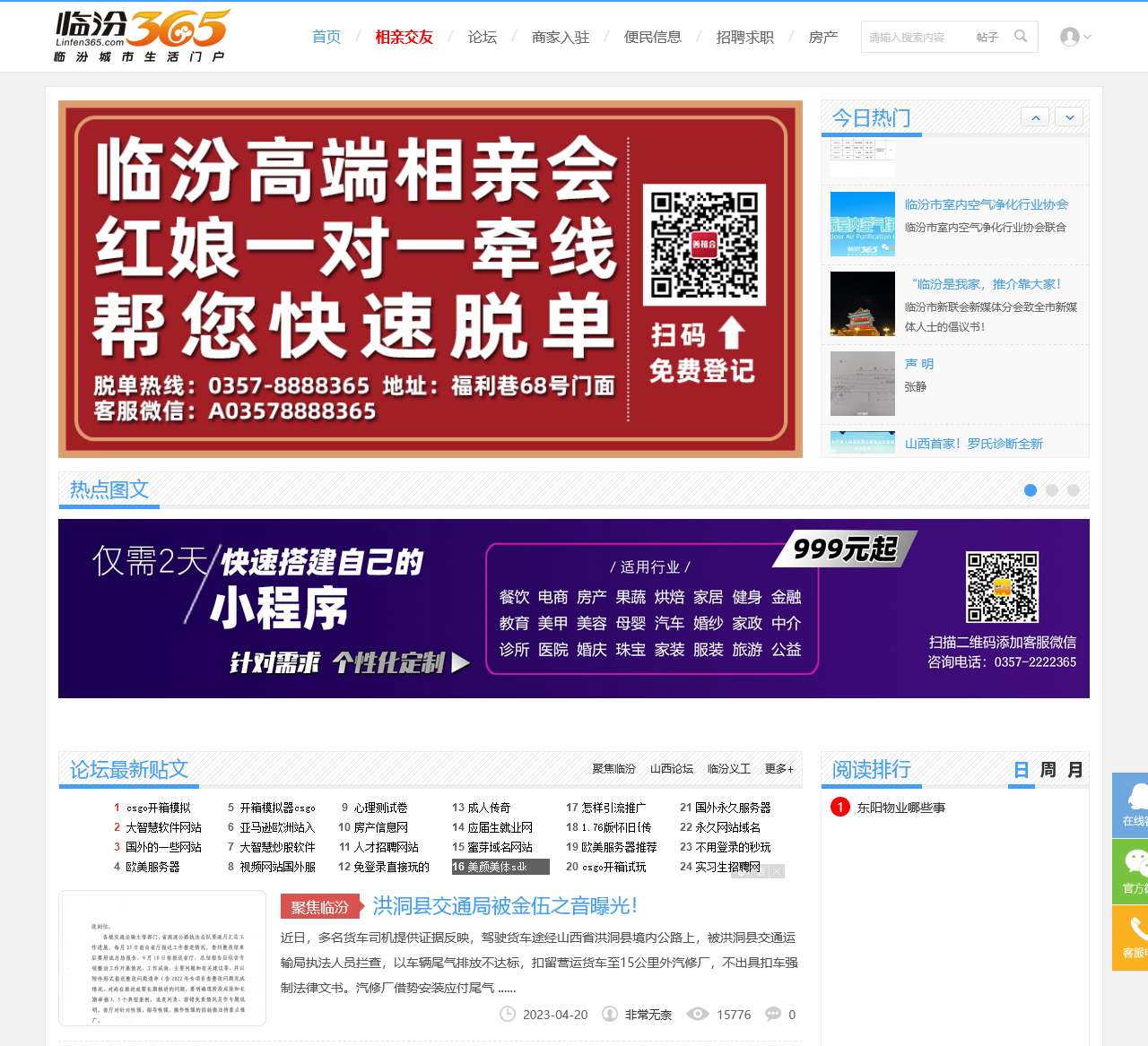 临汾365论坛是一个综合性社区网站,提供丰富的信息和交流平台,涵盖了相亲交友、同城婚恋、论坛BBS、商家入驻、便民信息、招聘求职、房产等内容。