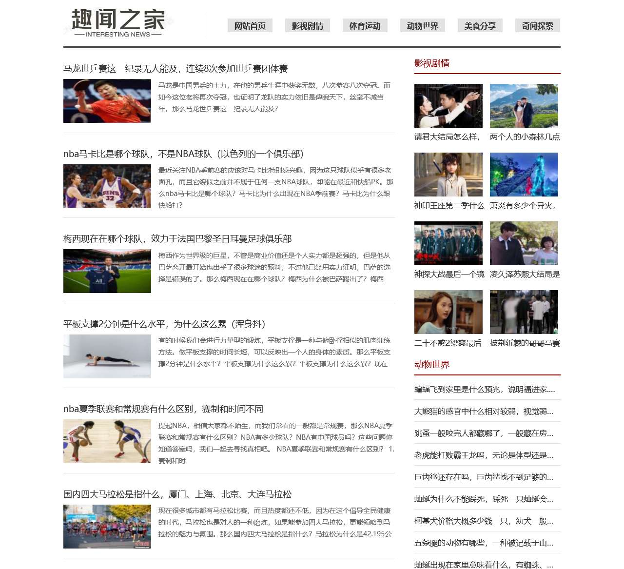 | 动物世界 | 老虎能打败霸王龙吗,无论是体型还是力量差距都太过悬殊了<br>巨齿鲨还存在吗,巨齿鲨找不到足够的食物渐渐灭绝了<br>蚰蜒为什么不能踩死,踩死一只蚰蜒会引来一群<br>柯基犬价格大致多少钱一只,幼犬一般需要1600至3500元一只<br>五条腿的动物有哪些,一种被记载于山海经上的生物<br>蚰蜒出目前家里意味着什么,有蜘蛛、蚂蚁、臭虫需要它来消灭了<br>大熊猫的感官中什么相对较弱,视觉弱而听觉与嗅觉灵敏<br>跳蚤一般咬完人都藏哪了,一般藏在房间的角落里<br>老虎最怕的三种东西,惧怕成年棕熊、犀牛、大象<br>蛇最怕的三种克星,人类、蜜獾、眼镜王蛇是天敌 |