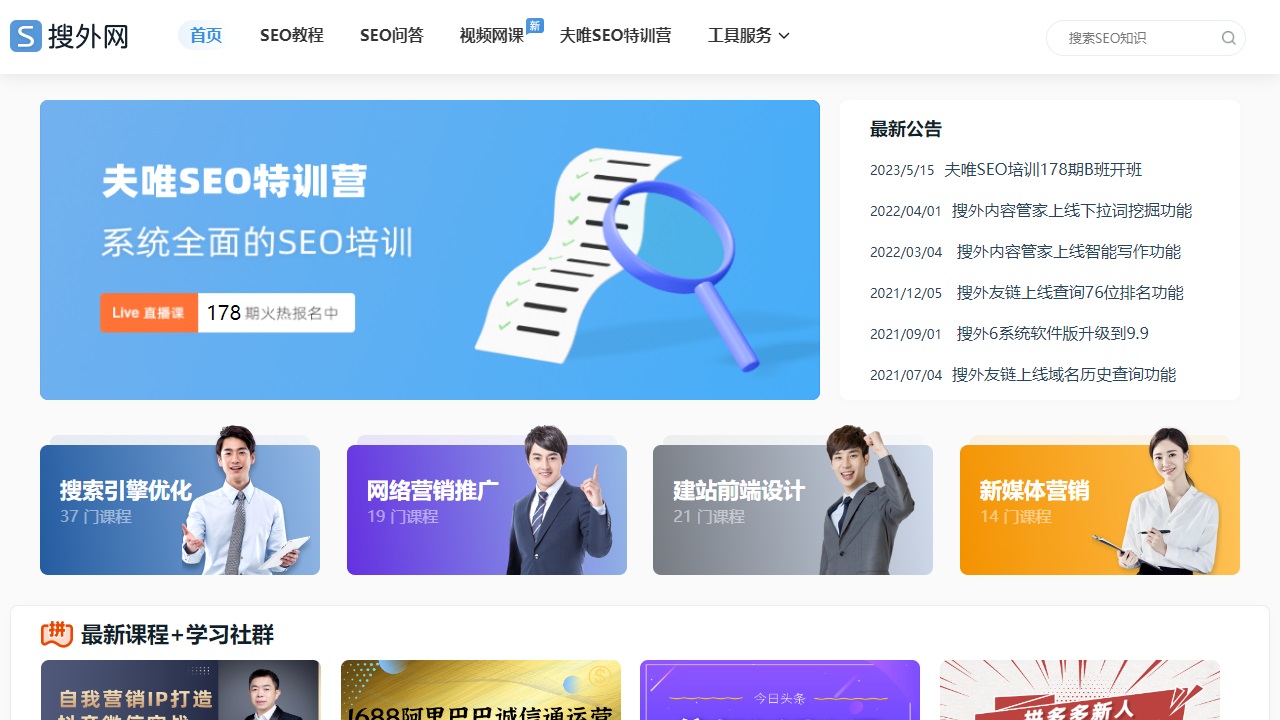 搜外网专注SEO培训以及网络营销技术视频网课。为广大站长提供SEO系统技术知识学习,掌握搜索引擎排名流量的获取技术。新增Google独立站SEO,另提供符合SEO优化的6系统、友链交换的搜外友链。