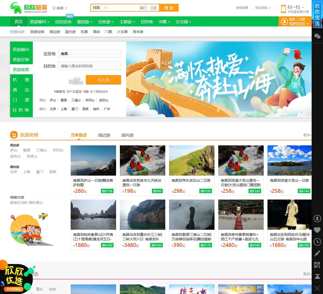 欣欣旅游网(CNCN.com)中国在线旅游超市为您提供100多万条旅游线路、门票、签证、酒店等预订服务…为您量身定制不一样的旅行…更新时间:23-07-22 14:16:03