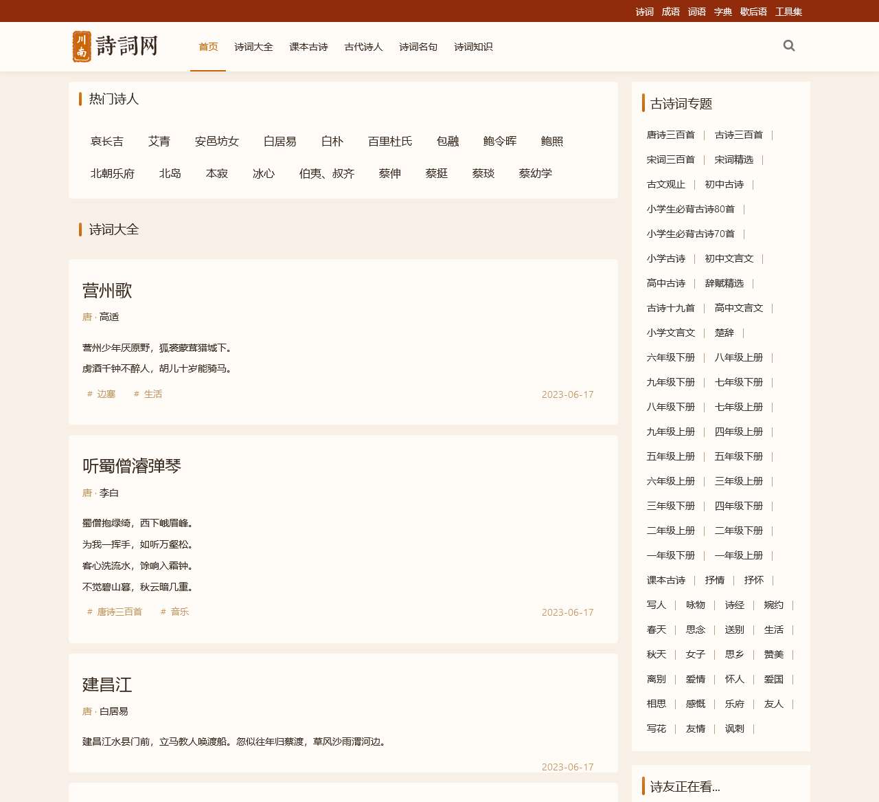 川南诗词网(www.cnpoem.net)收录近10万首诗词。包含诗词精简版、大全版、国外名诗、成语大全、汉字大全、词语大全等版块