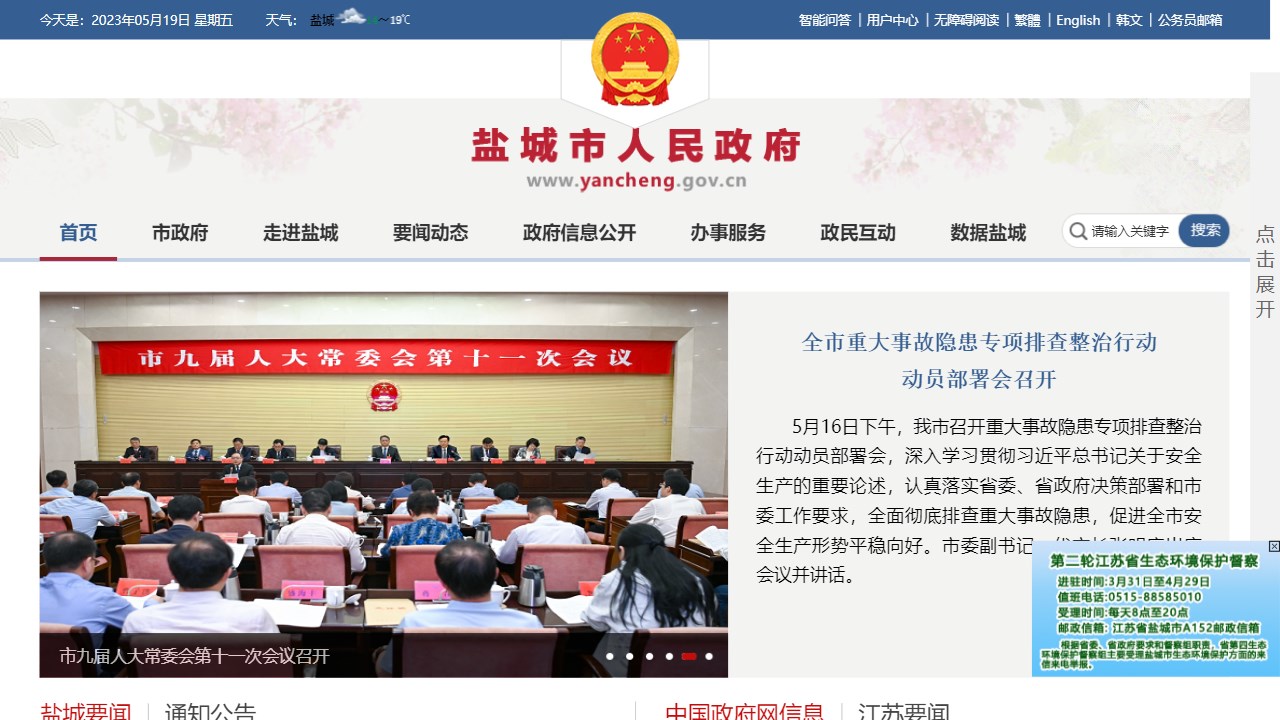 “中国盐城”政府网站由盐城市人民政府主办,以展示盐城形象、推行政务公开、及时发布政府信息、便民便企服务项目、增强政府与社会、政府与民众的沟通为主要任务,是一个功能较为齐全、基础较为完善、面向公众的信息发布平台。