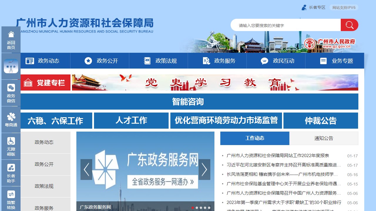 广州市人力资源和社会保障局门户网站(网址:http://rsj.gz.gov.cn/ )坚持“统一规划、统一标准、统一平台、统一门户、统一管理、资源共享、安全保密”的建设原则,突出“以服务对象为中心”的指导思想,着力于服务创新,资源整合,延展覆盖范围,优化业务流程,协同业务,共享数据,积极推进“互联网+政务”建设,打造一流的人力资源和社会保障公共服务平台。