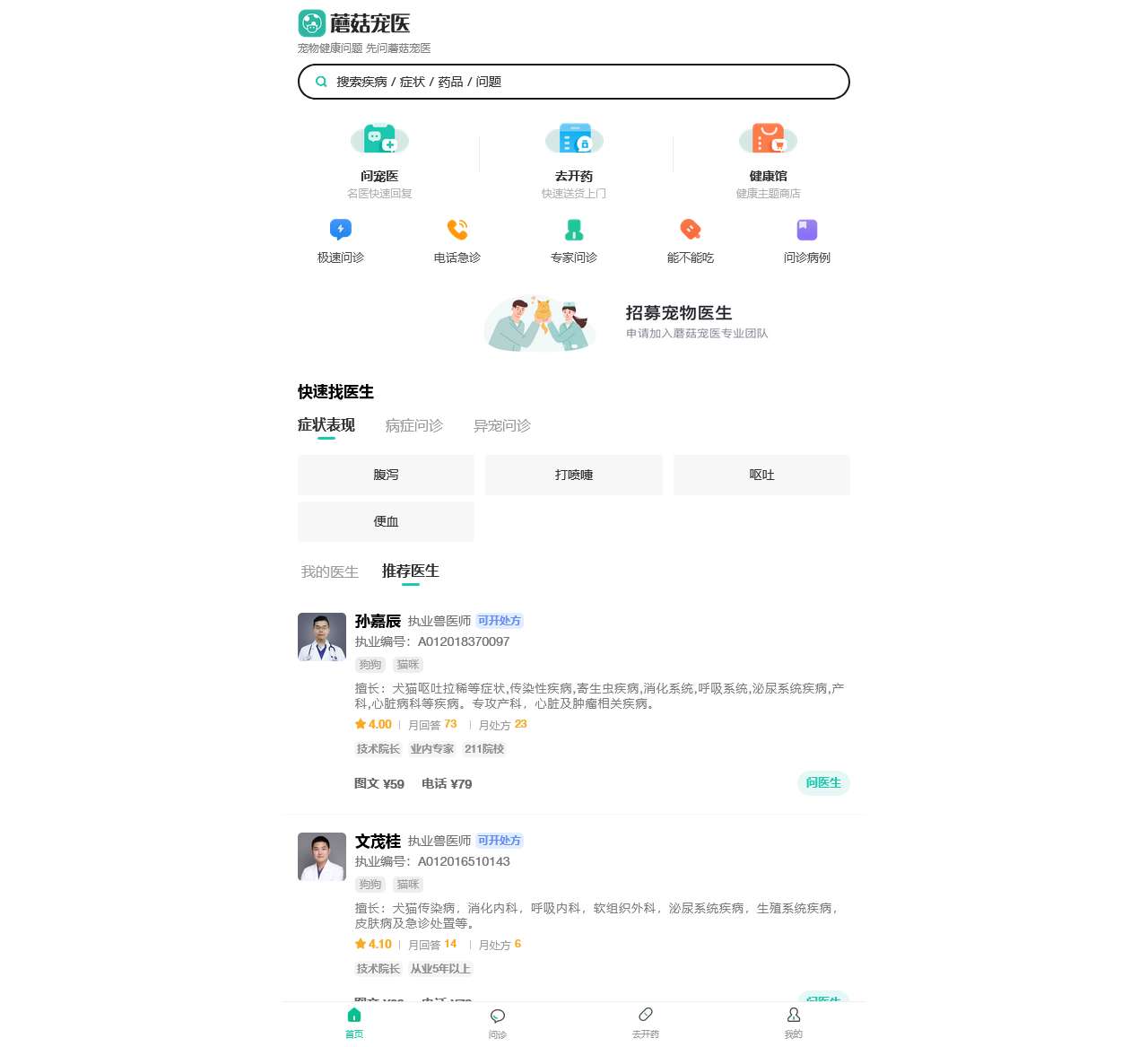 宠物医生在线咨询,就上蘑菇宠医,这里有资深兽医在线咨询和解答,为有宠物医疗需求的宠主提供宠物医院医生在线问诊服务,还提供宠物饲养知识,宠物日常用品与药品购买,宠物医疗常识等。