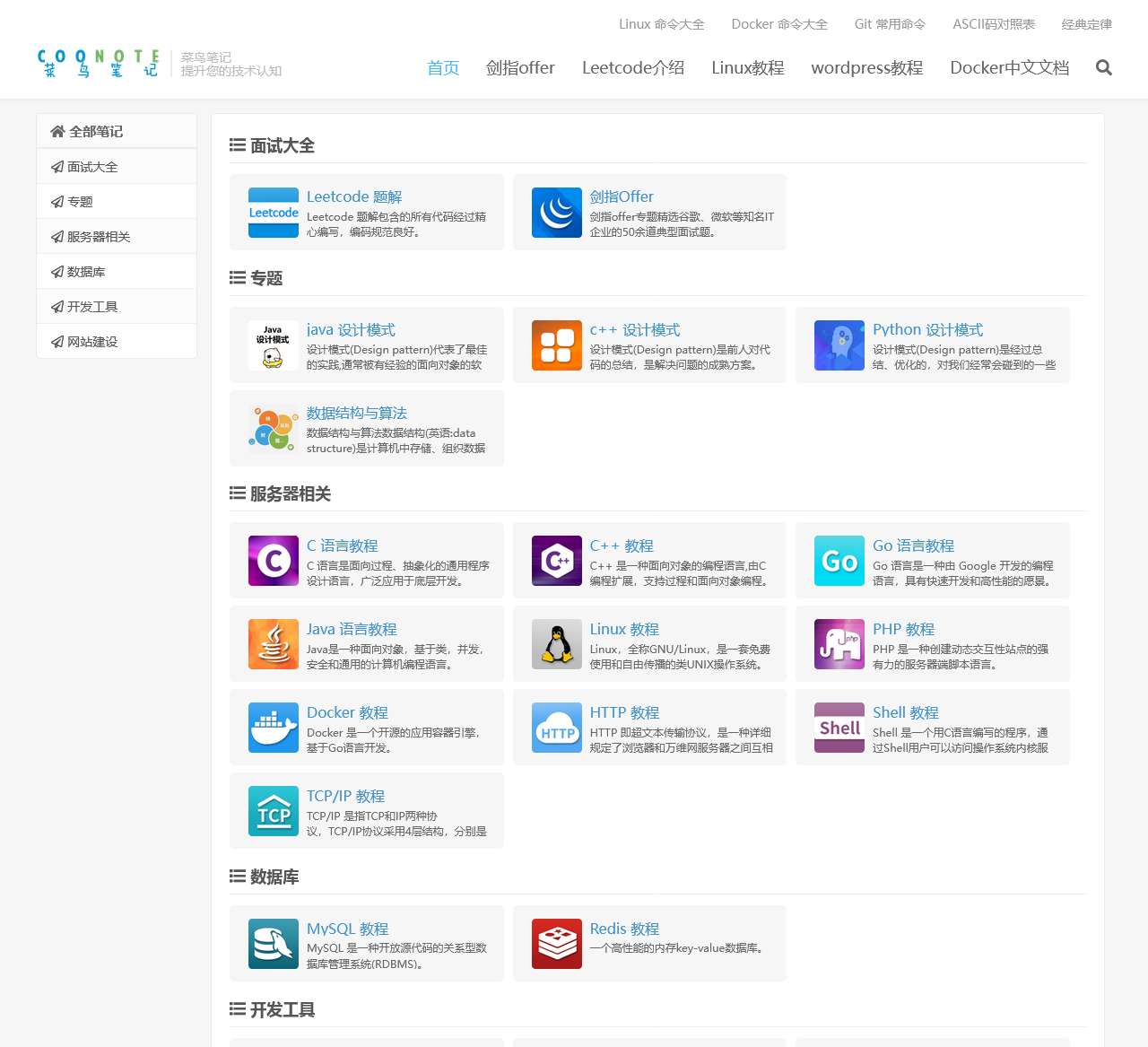 菜鸟笔记(www.coonote.com)分享编程的基础教程笔记及面试题和算法题,介绍c++、redis、python、数据库、mysql面试和算法等各种编程语言的基础知识及编程技巧等IT教程学习数据结构与算法网站。