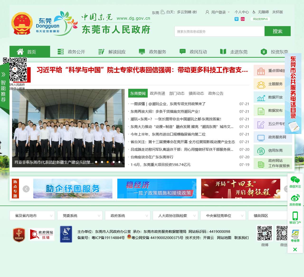 东莞市人民政府门户网站(网址:www.dg.gov.cn)是由东莞市人民政府办公室主办,东莞市政务服务数据管理局承办。它以政府部门网站和镇街频道为依托,以需求为导向,以服务为宗旨,遵循‘以人为本’的设计理念,围绕信息公开、在线服务和公众参与三大政府网站功能定位,设置了‘政务公开’、‘解读回应’、‘政务服务’、‘政民互动’、‘走进东莞’五大频道,以丰富的内容、人性化的服务和强大的功能为用户提供服务。