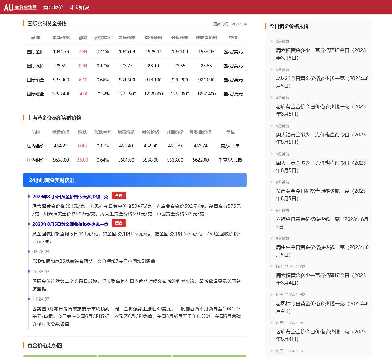 黄金首饰价格今天多少一克?黄金价格今日最新价多少钱一克?查看黄金今日价格及黄金回收价格实时报价,提供黄金价格实时走势图、国际黄金价格实时行情、国内金价实时行情今日、品牌金店黄金价格今日报价(如老凤祥、周大福、老庙黄金、周生生、六福珠宝、中国黄金、周六福、周大生等)今天金价信息。