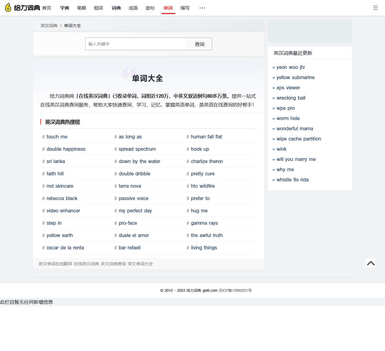 给力词典网「在线英汉词典」已收录单词、词组近120万,以及中英文双语例句80多万条。为大家提供一站式在线英汉词典查询服务,帮助大家快速查询、学习、记忆单词,掌握英语单词,是英语在线查询的好帮手!