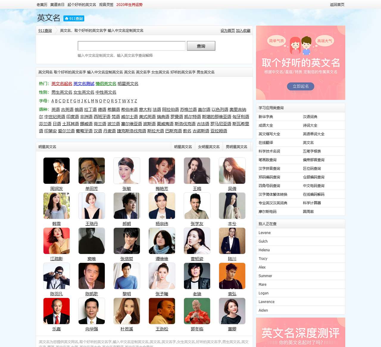 This organized information provides a clear overview of the available English name categories and celebrity names on the website, making it user-friendly for visitors looking for English names and related services.