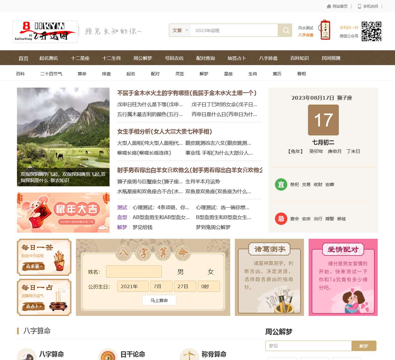 免费的算命网站-开运算命网提供:免费算命,姓名测试,周易,生辰八字算命,四柱算命预测,算卦,黄道吉日查询,抽签算命,生肖算命,在线排盘和趣味测试等在线免费算命内容!