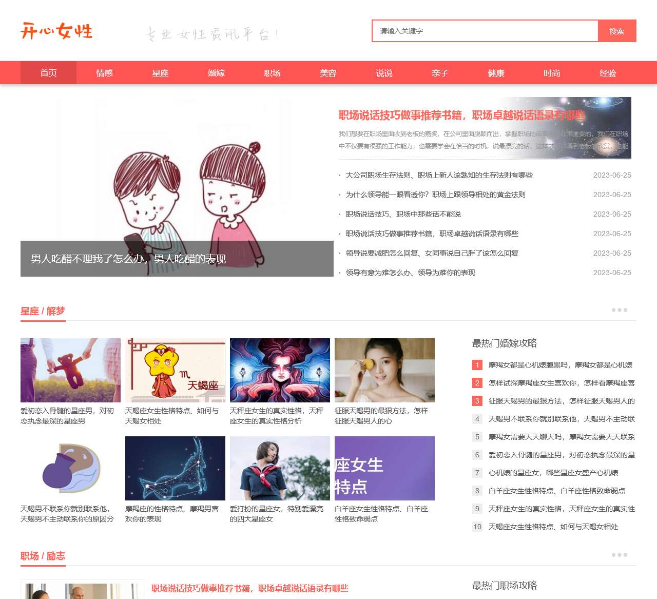 欢迎来到开心女性网,您的专业女性资讯平台!我们致力于陪伴女性成长,为您提供丰富多彩的内容,涵盖情感、星座、婚嫁、职场、美容、亲子、健康、时尚、经验、问答等多个领域。无论您对哪个方面有兴趣或需求,我们都有相关的精彩内容,助您更好地理解自己,提升生活质量。