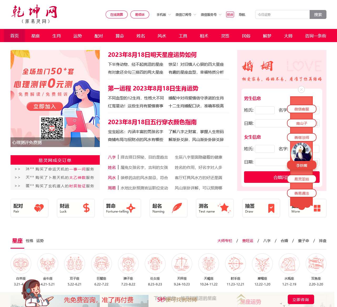 乾坤网(原易灵算命网)(www.d02.cn):真人预测,大师全部来自全国各地,为网友提供在线实时批八字、看风水、起名改名、风水策划等高质量的预测服务!免费试算过去,不准不收费。