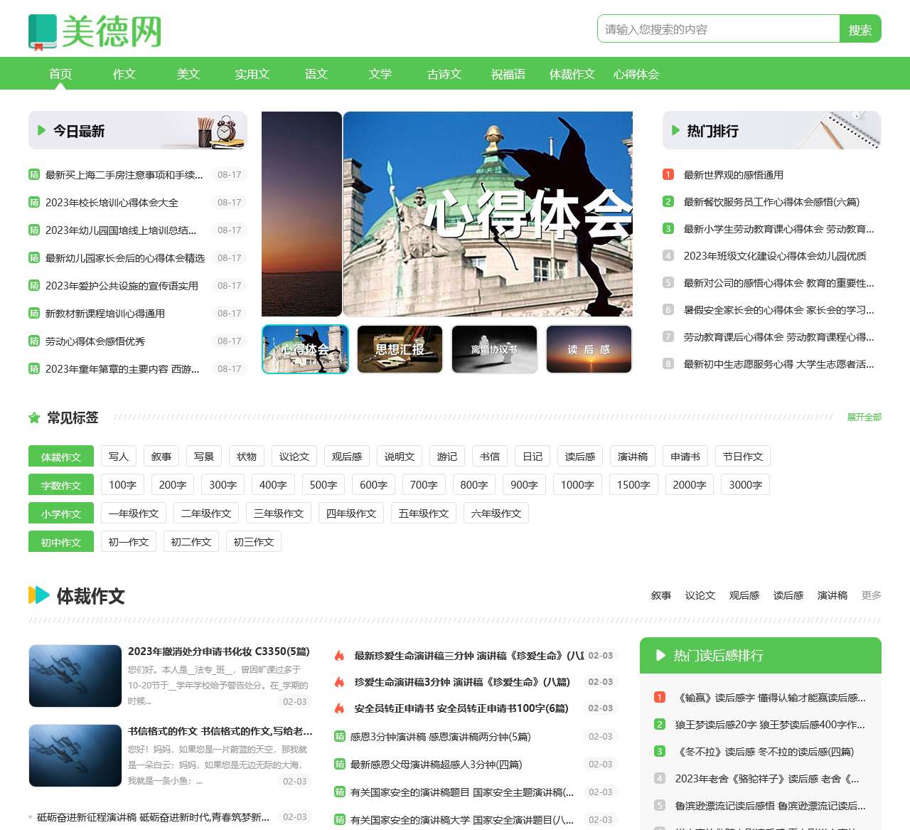 多样性的素材:美德网提供了丰富多彩的素材,包括体裁作文、实用文、语文学习、文学作品、古诗文、祝福语等,覆盖了中小学阶段的教育需求。