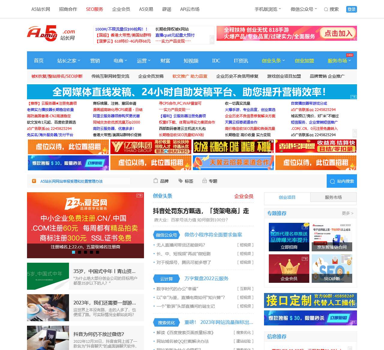 A5站长网致力于为站长提供广泛的信息和服务,涵盖了招商合作、SEO服务、企业会员、A5交易等多个领域。站长们可以在这里找到各种有关网站运营、建站经验、搜索优化、编程技术、数据库、电商、电商新闻、电商培训、产品运营、新媒体运营、短视频、IDC IT资讯、创业头条、创业经验、创业故事、投资融资、前沿领域、创业加盟、服务市场等方面的信息和资源。