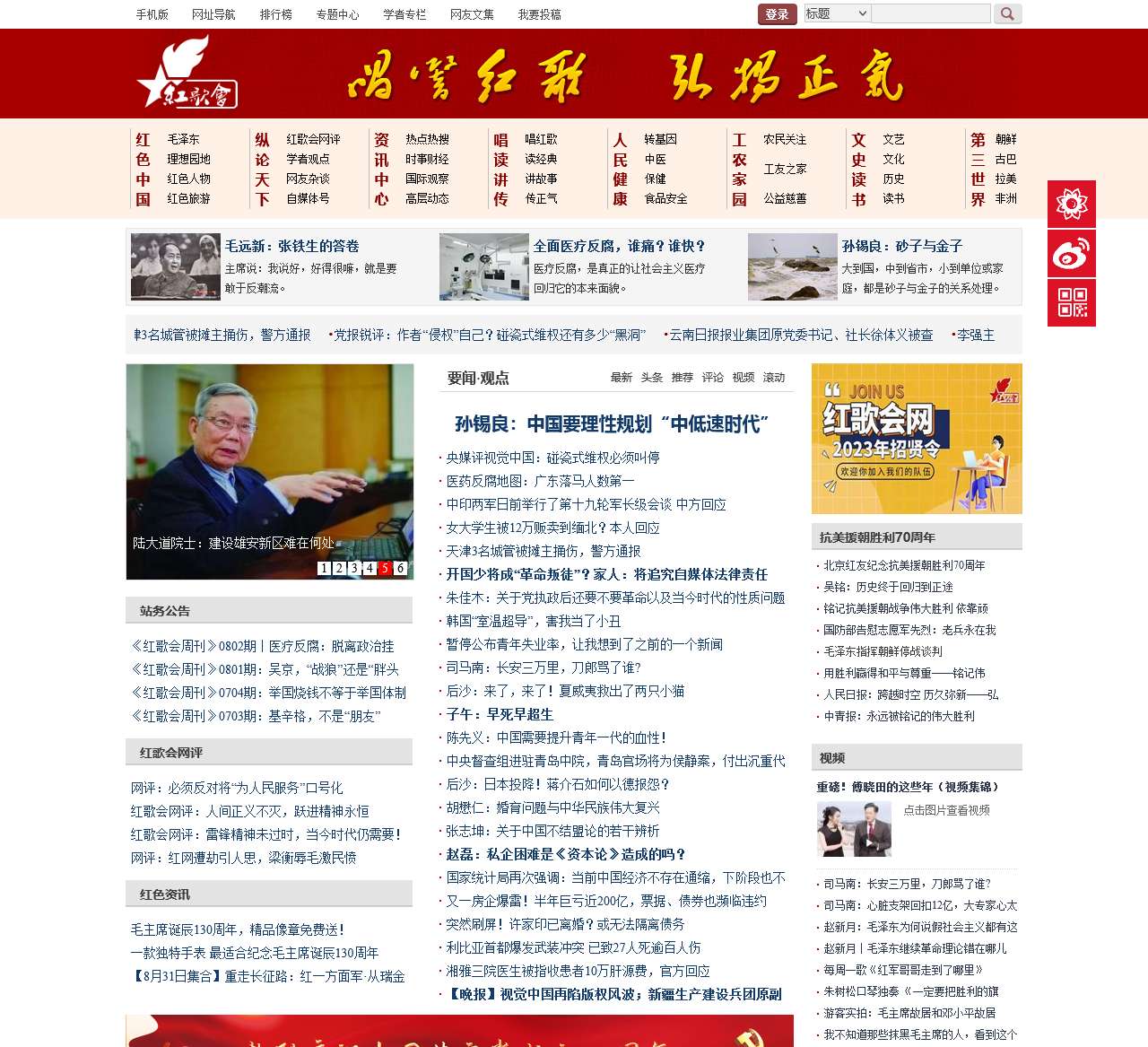 中国目前最具知名度和影响力的红色爱国网站之一。红歌会网基于一贯的人民立场,高举爱国主义旗帜,唱响红歌,弘扬正气,宣传毛泽东思想和红色文化,反映老百姓的呼声,推动社会公平正义,维护国家和民族根本利益。