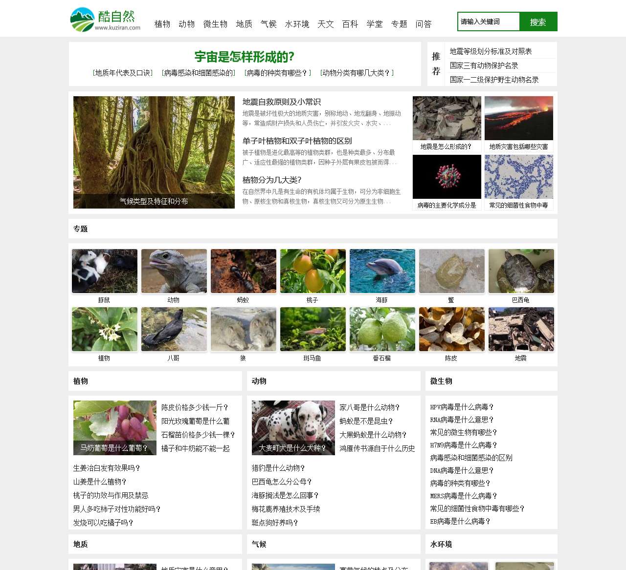 酷自然(kuziran.com)是一个自然百科网站,主要内容包括植物、动物、微生物、地质、气候、水环境、天文等。