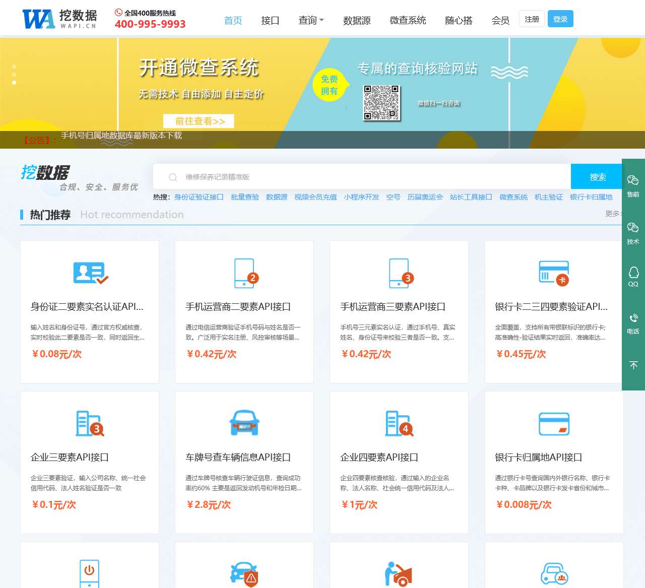 提供免费、付费、定制api数据接口,可在线查询及调试api接口数据;无需技术也可使用的数据接口,excel批量查询下载结果,多用户在线快捷查询功能,可订制需要的接口。