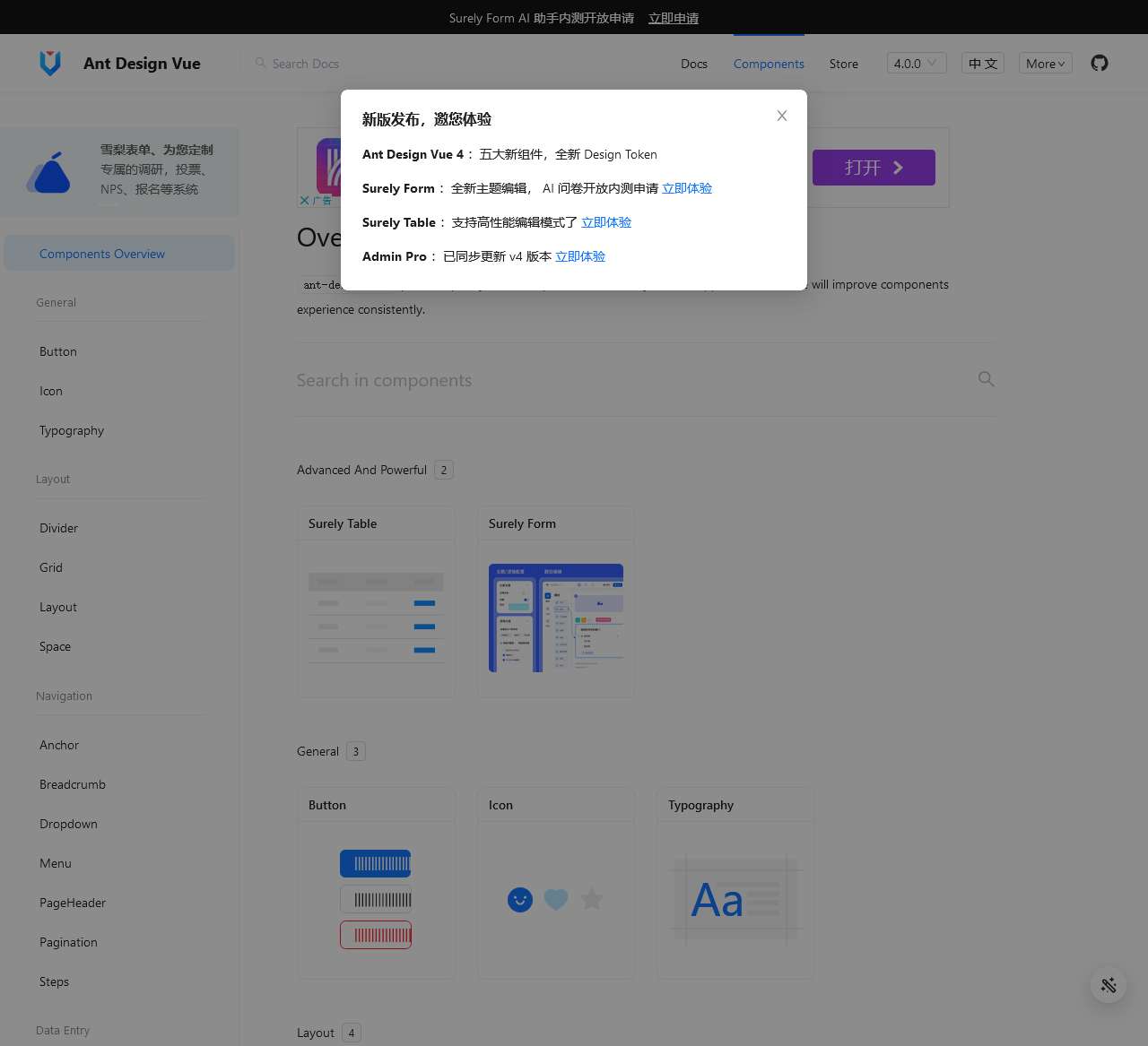 Ant Design Vue also offers specialized components like “Surely Table” and “Surely Form,” designed to make website development faster and more efficient. “Surely Table” allows you to create tables for data presentation and manipulation, while “Surely Form” provides tools for building customized survey, voting, NPS, registration, and other data input systems.