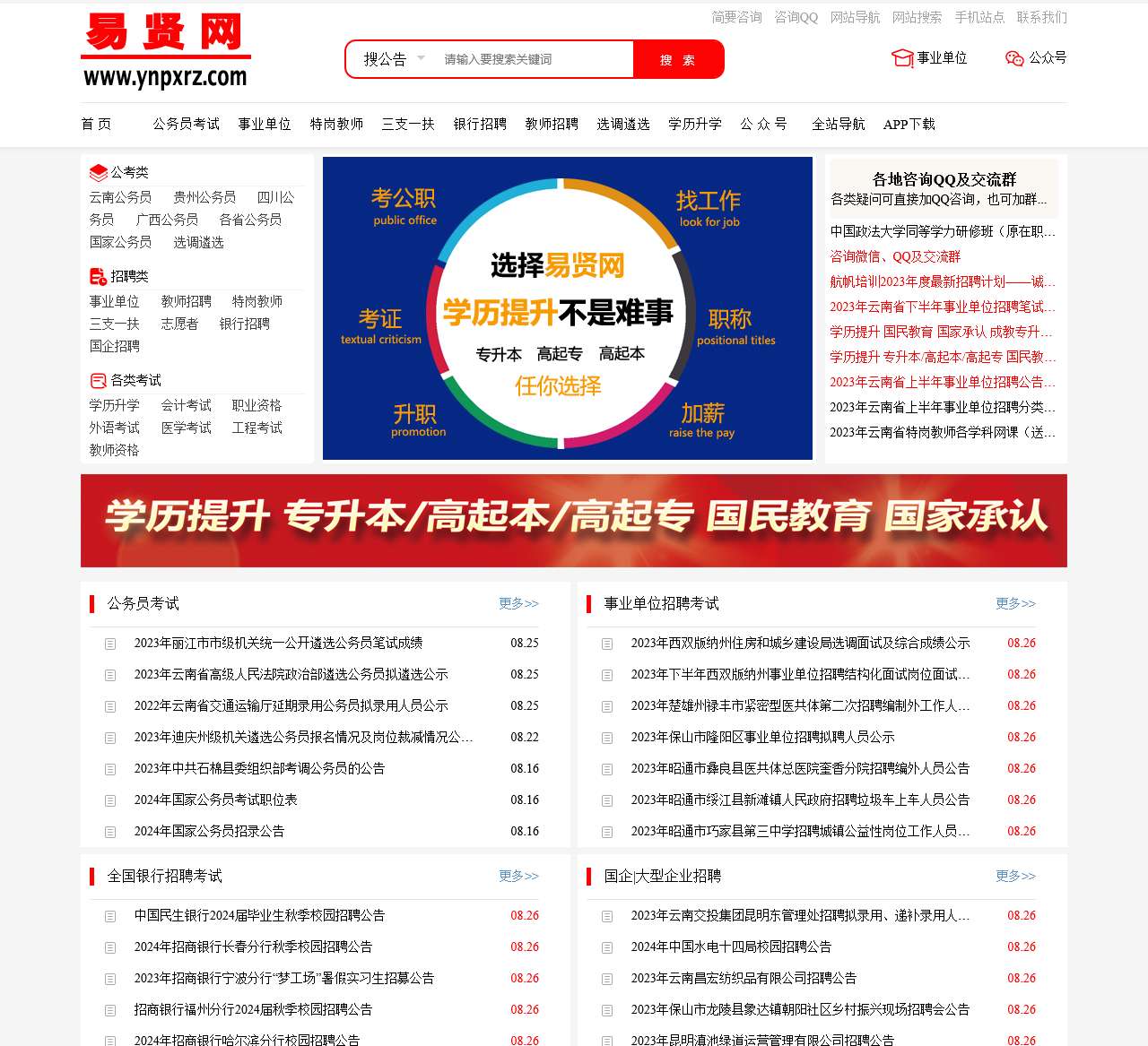 易贤网提供招聘、人才、人事、考试、招生、认证、培训相关的时间、信息、报名、成绩查询、资料、试题等;主要有高考、自考、专升本考试、人事考试、公务员考试、大学生村官考试、特岗教师招聘考试、事业单位招聘考试、企业人才招聘、银行招聘、教师招聘、农村信用社招聘、各类资格证书考试等。