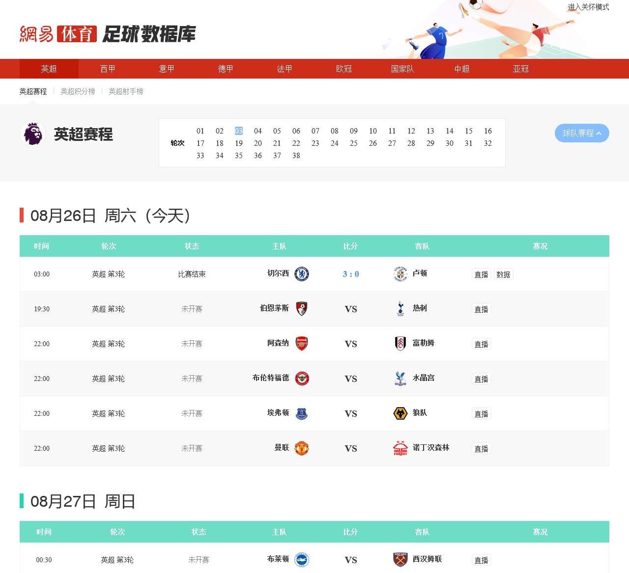 网易国际足球数据直播系统提供足球直播、足球比分和足球赛程,涵盖英超、意甲、西甲、德甲、法甲、欧洲联赛、欧洲冠军杯,提供国际足球前瞻与战报、国际足球排行榜和国际足球资料库等信息。