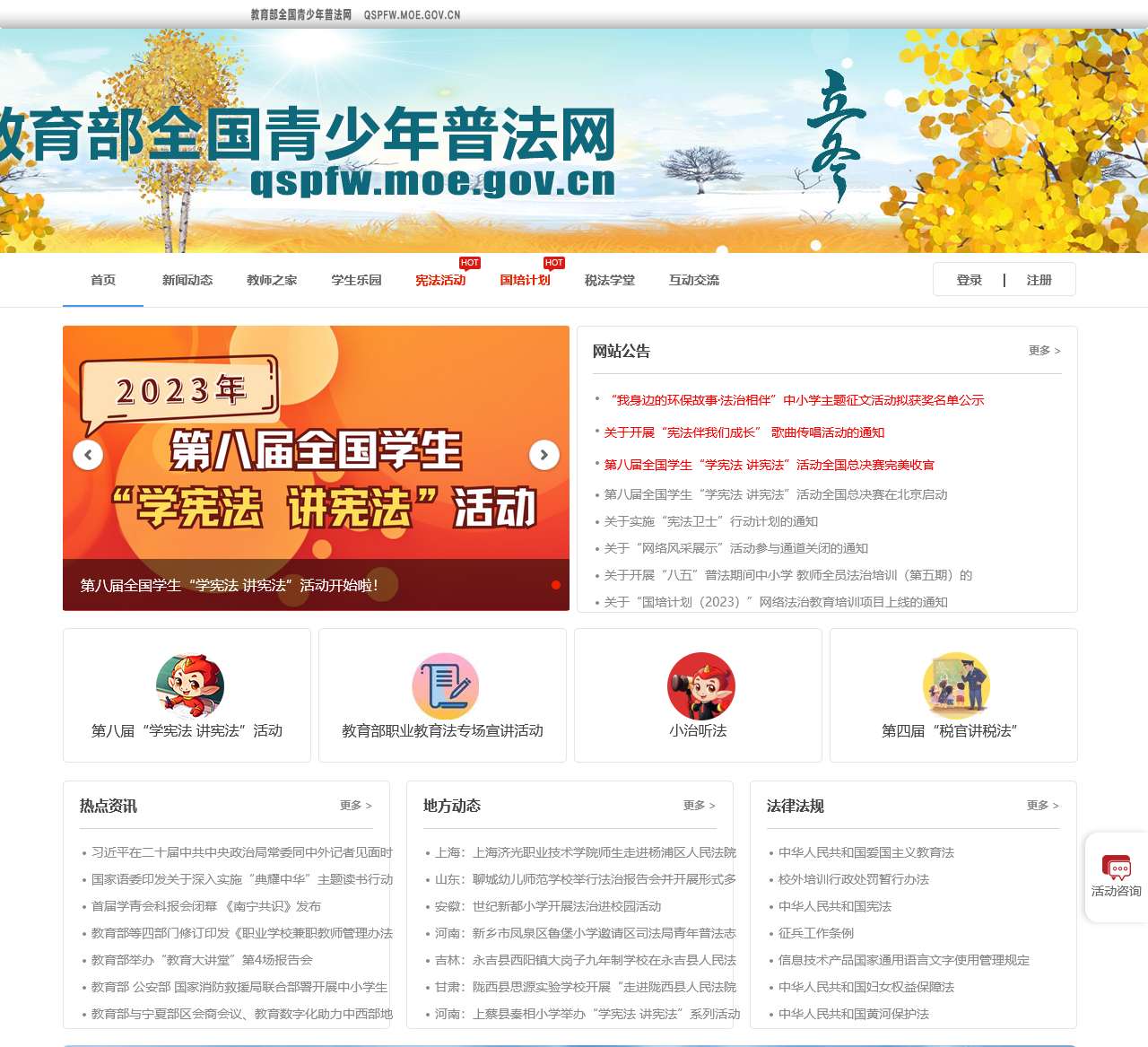 欢迎来到教育部全国青少年普法网,这里是关于宪法教育和法治活动的专业平台。通过我们精心策划的各项活动和丰富多彩的内容,我们致力于培养青少年的法治意识,推动法治精神深入学校和社区。
