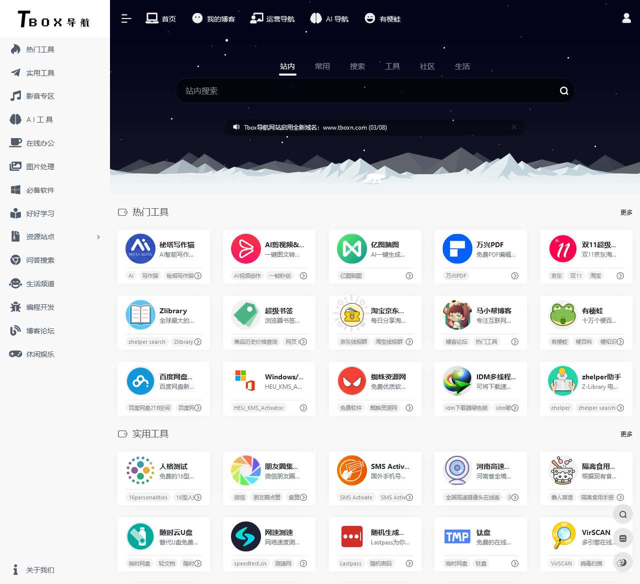 Tbox导航是一个集合大量优质在线工具的导航网站,包括实用工具、影音工具、图片工具、编程工具、网络资源等几十种分类,覆盖全网在线工具,只收录最优质的的精品网站,做一个真正有用好用的工具导航网站。