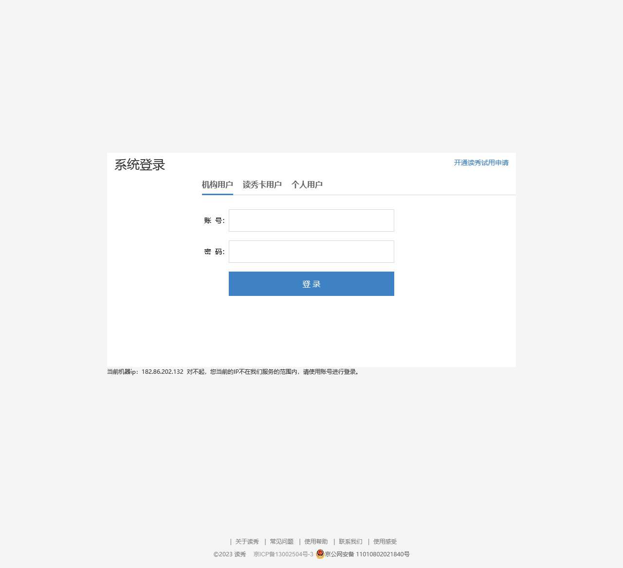 无论您是机构用户、读秀卡用户还是个人用户,都可以通过申请试用来体验我们强劲的学术搜索功能。开通试用是了解我们服务优势的好机会,让您在决定正式使用前充分了解读秀的强劲功能。