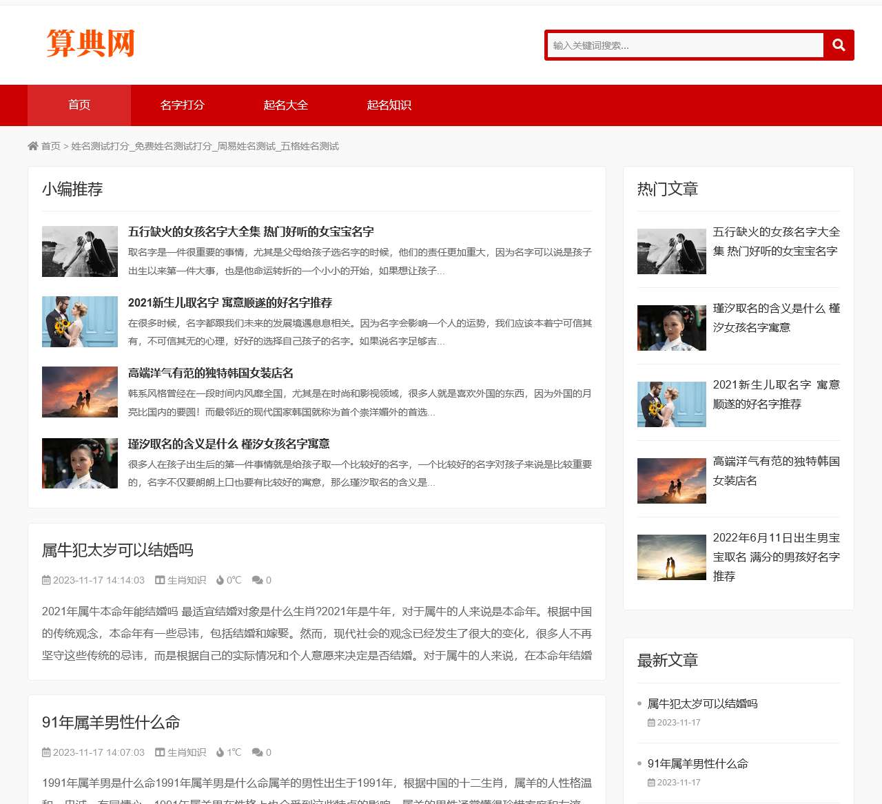 算典网是一家专业提供姓名测试打分服务的网站,致力于为用户提供免费姓名测试打分、周易姓名测试等服务。以下是网站首页内容的整理: