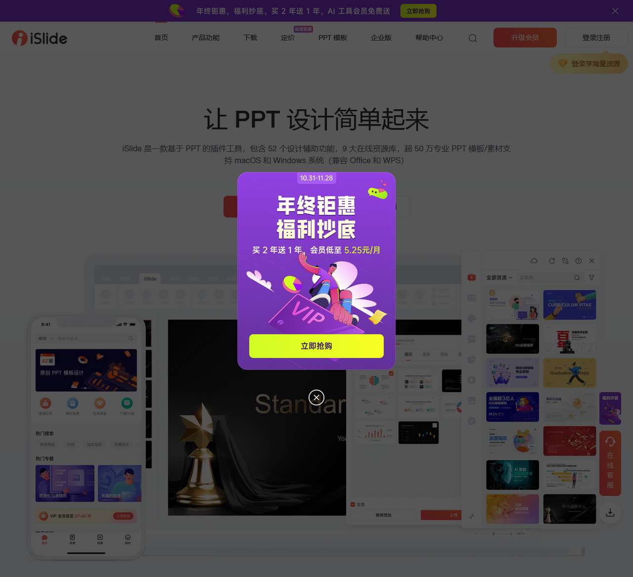 iSlide是一款专业的PPT设计工具,旨在让PPT设计变得简单而高效。通过我们强劲的功能和丰富的PPT模板库,用户可以轻松创建出令人印象深刻的演示文稿。以下是iSlide的主要产品功能: