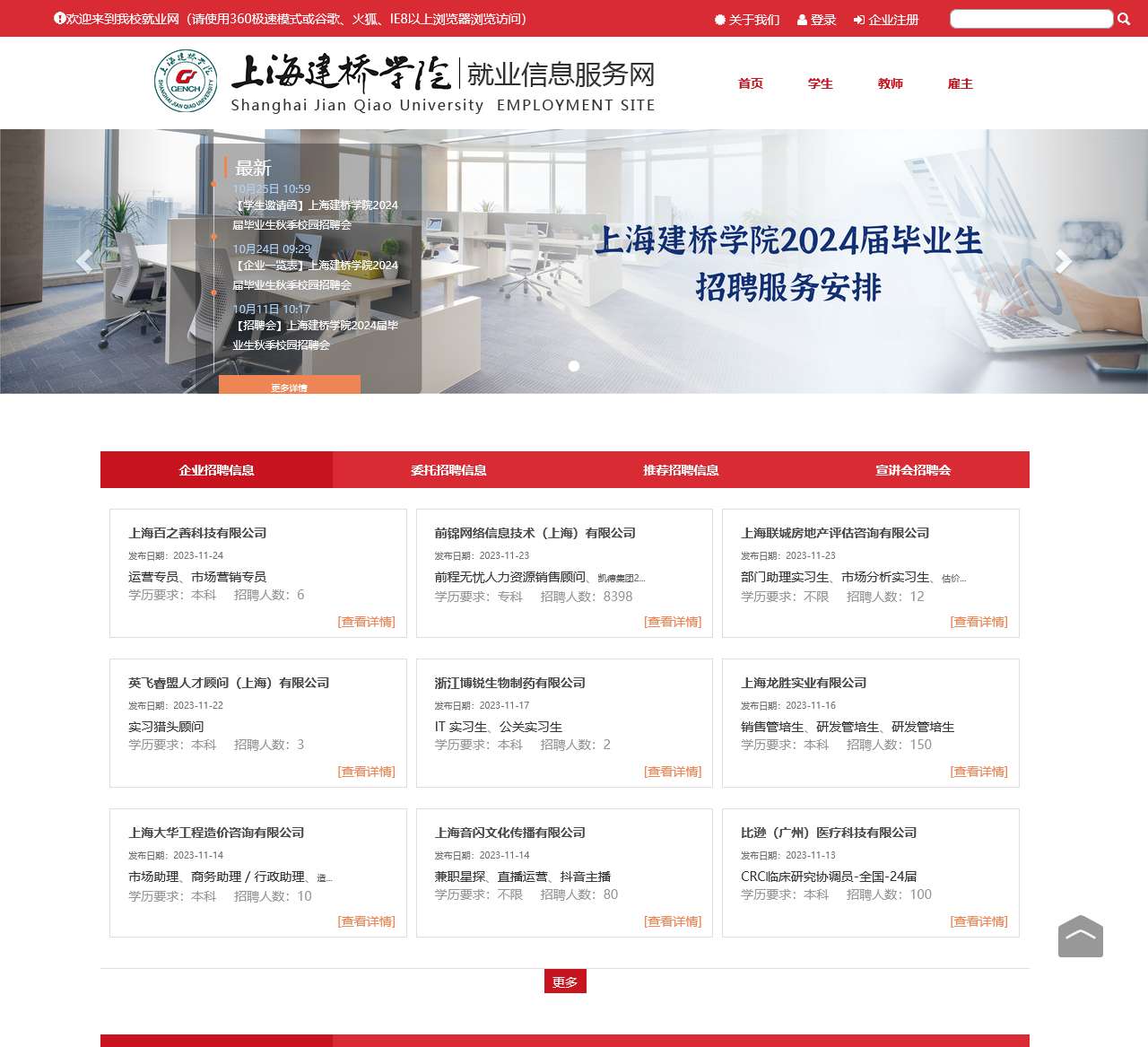 欢迎访问上海建桥学院就业信息服务网,提供全面的校园招聘信息,为学生、教师和雇主提供便捷的就业服务。以下是一些重大信息和近期招聘会详情。