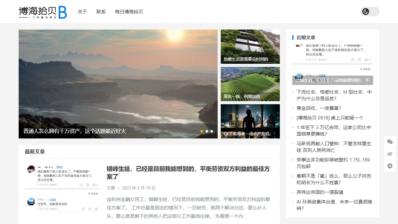 博海拾贝是一个多领域内容聚合网站,提供各种有趣和有用的信息。该网站关注的主题包括错峰生娃、社会格差、黄金回收、桌上游戏选择、公司利润、人口警告、家用电器、历史问题、科技裂缝、明星八卦以及其他多种话题。