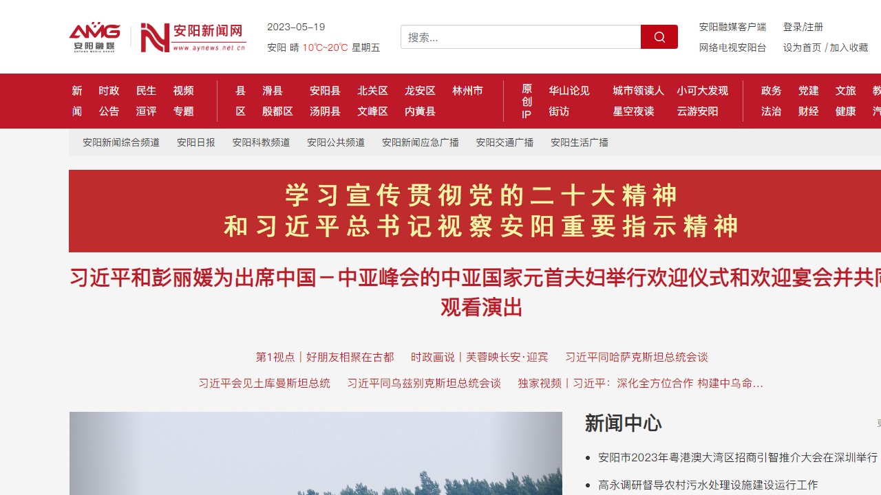 在新闻板块中,安阳新闻首页展示了一些重大新闻的标题和摘要。其中包括习近平和彭丽媛为出席中国-中亚峰会的中亚国家元首夫妇举行欢迎仪式和欢迎宴会并共同观看演出的报道,以及习近平同哈萨克斯坦总统、乌兹别克斯坦总统会谈的消息。这些报道突出了国际交往和重大会议的重大性。