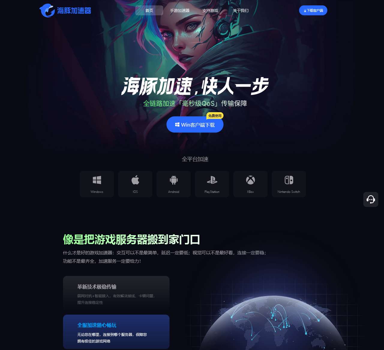 海豚网游加速器,全链路加速,毫秒级QoS传输保障!至臻加速绝地求生、Apex英雄、无畏契约等国内外热门游戏,一键将服务器搬至家里!支持千款游戏,24小时同步覆盖新游!完美解决用...