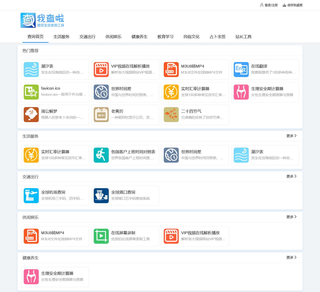 我查啦提供方便快捷的网页查询工具。包括生活服务查询、交通出行查询、休闲娱乐、健康养生、教育学习工具、民俗查询、占卜查询和站长工具。