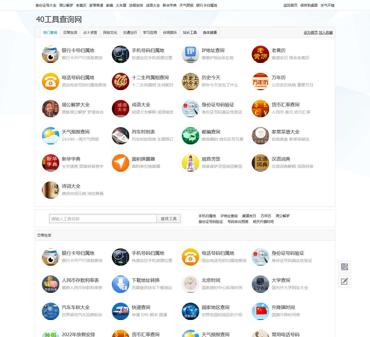 40工具查询网为你提供免费实用查询工具:上面有几百个实用查询工具大全、观音灵签、列车时刻表、IP地址查询、邮政编码、观音灵签、十二生肖运势、翻译、周公解梦、区号邮编、字典词典,、谜语在线翻译等查询工具。