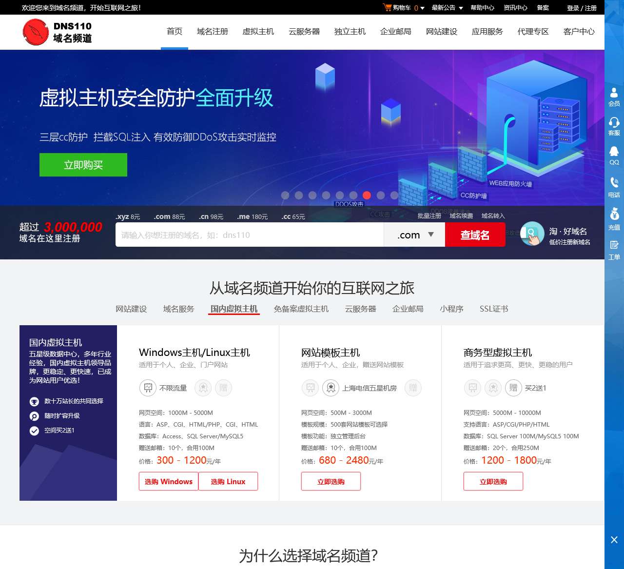 DNS110域名频道立足上海,服务于数十万全国企业,专业提供域名申请注册、虚拟主机租用、企业邮箱、网站建设服务。现全新推出海外主机,云主机,云邮箱的租用服务。