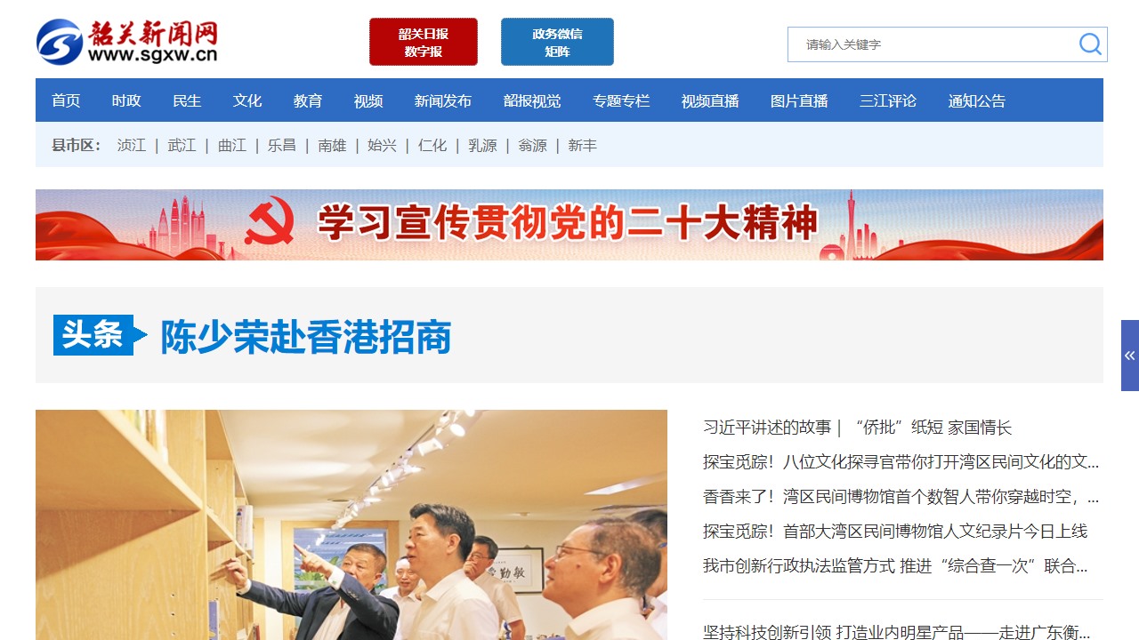 除了新闻报道外,首页还展示了一些重大的通知公告和专题活动,如韶报视觉和陈少荣赴香港招商等。这些内容丰富了网站的版块,使用户可以更全面地了解韶关的新闻和活动。