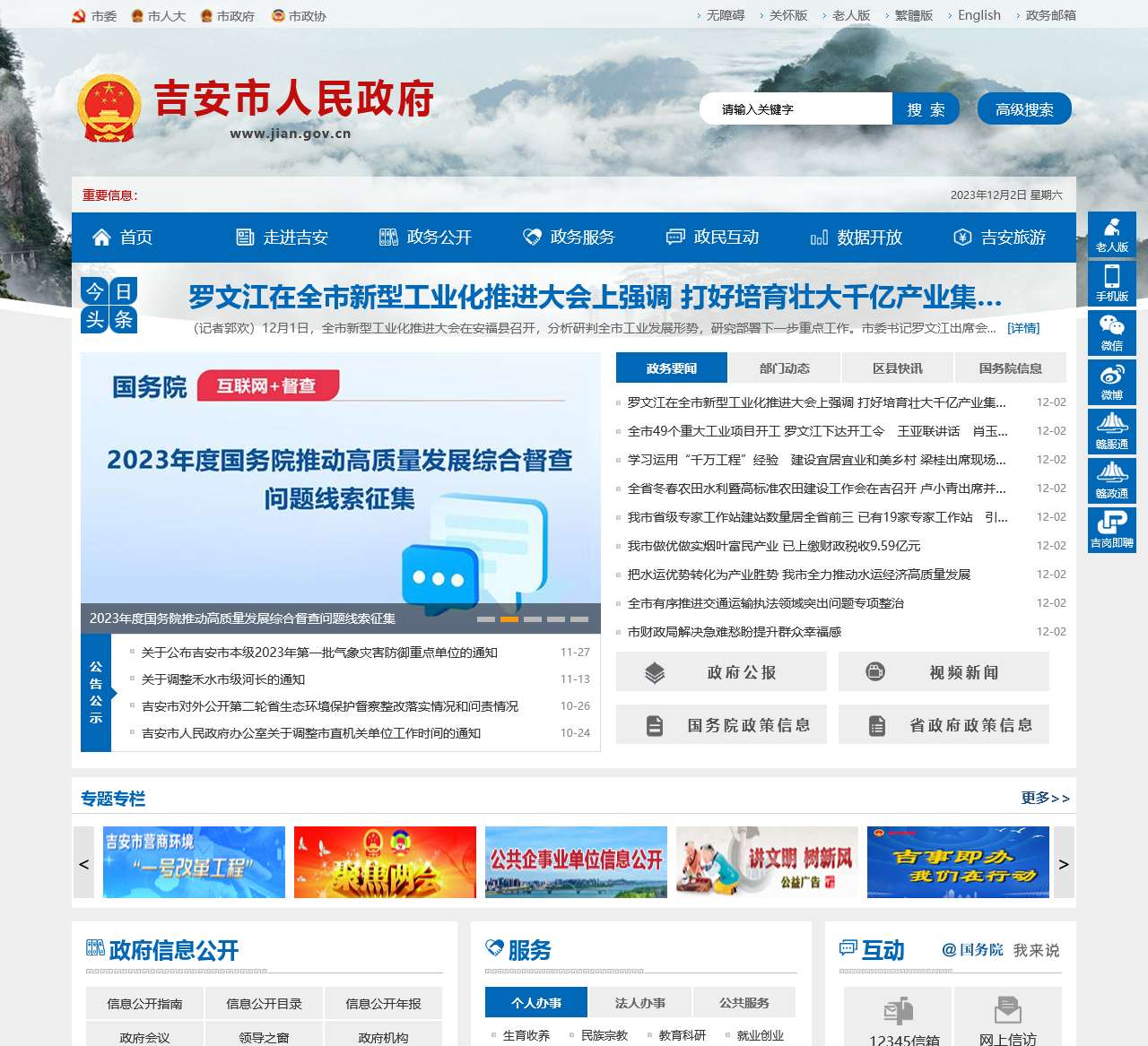 欢迎访问吉安市人民政府官方网站,我们致力于为您提供全面、及时、便捷的政务信息和服务。通过本网站,您可以深入了解吉安市的各项工作、政策以及丰富多彩的旅游资源。
