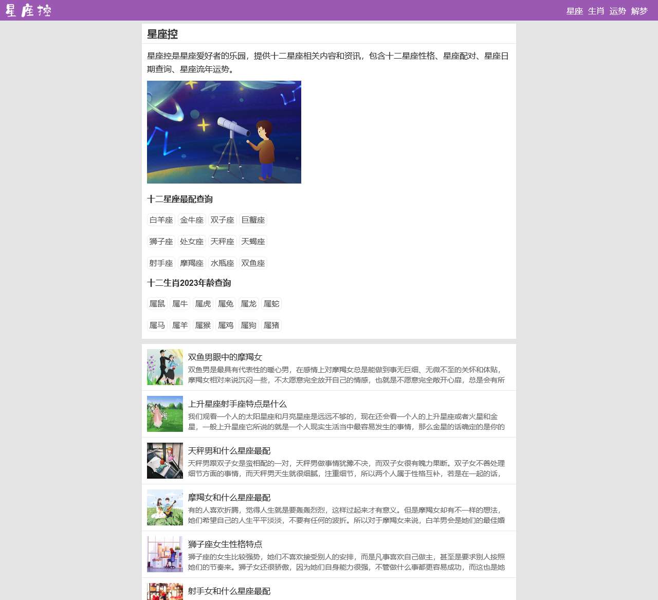 欢迎来到星座控,您来自星星的乐园!我们致力于为您提供关于星座、生肖、运势和解梦的全面信息。无论您是白羊座、金牛座、还是双鱼座,我们都为您准备了详尽的内容,协助您更好地了解自己的性格、运势和潜在的搭配。