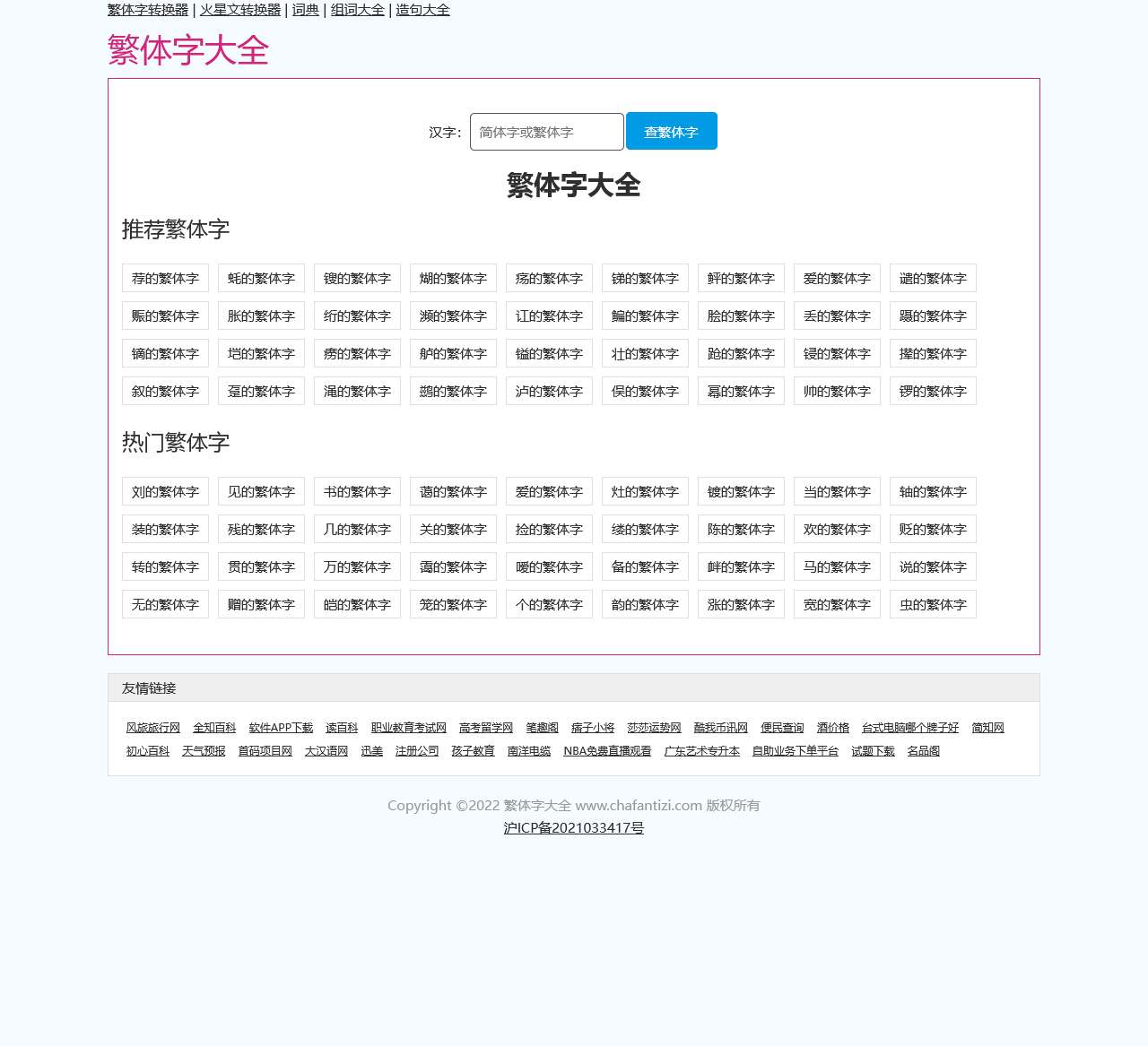欢迎使用我们的繁体字大全,这是一个全面的繁体字字典和查询工具,涵盖了丰富的繁体字词汇,为您提供便捷的查询服务。在这里,您可以轻松地找到繁体字的写法、组词、造句等信息。同时,我们还提供了繁体字转换器和火星文转换器,为您带来更多有趣的文字体验。