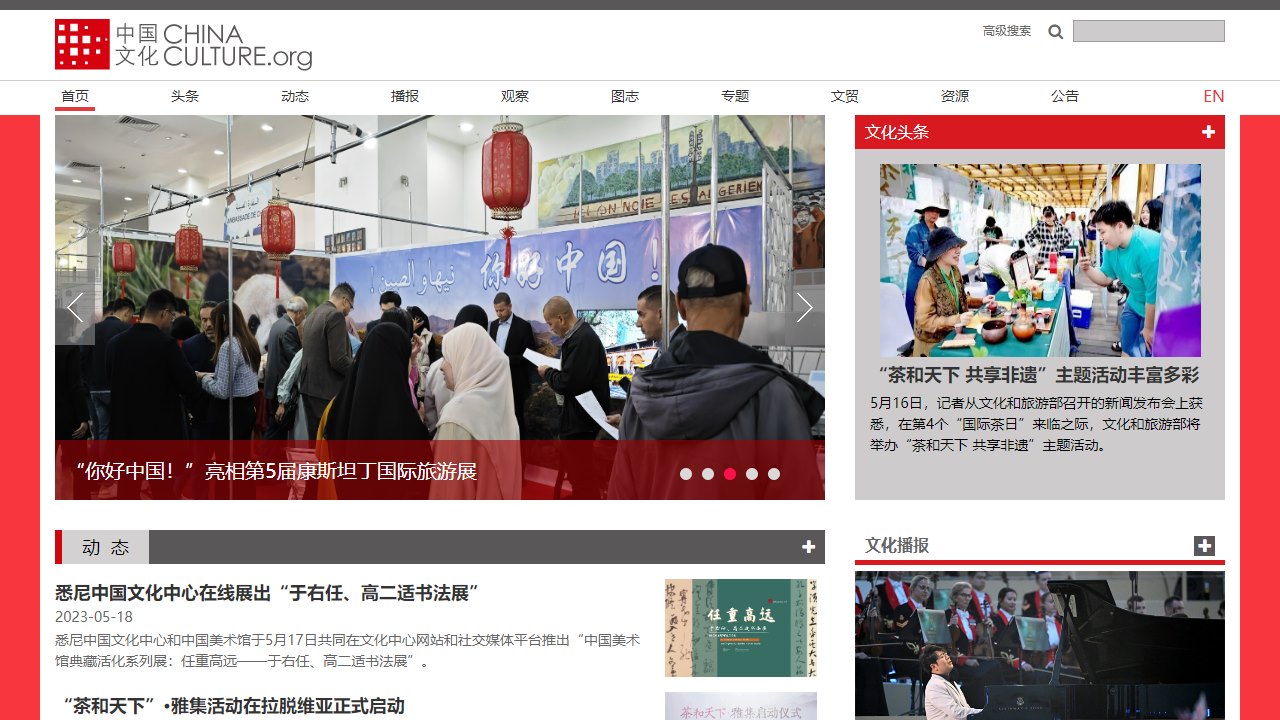 中国文化网是一个致力于推广中国文化的网站。网站首页展示了各类活动和动态,涵盖了国内外的文化交流、展览、音乐会、舞剧等内容。