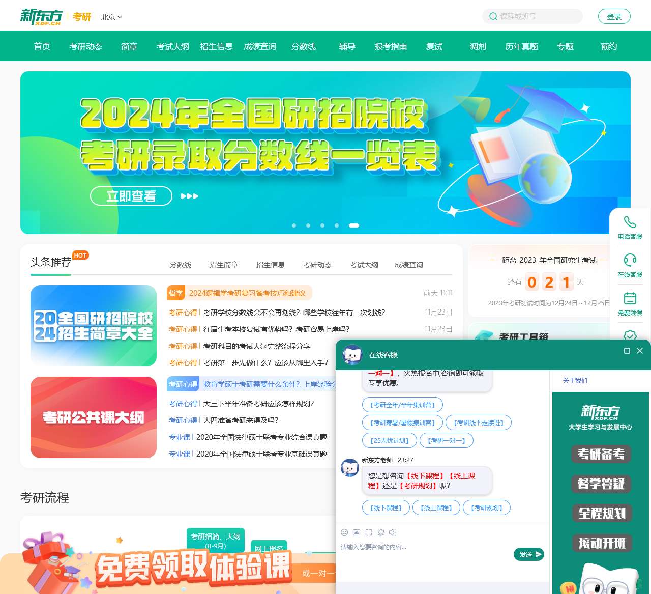 新东方考研网是以考研资讯,考研辅导为主题的官方网站,主要提供考研报考信息、考研报名时间、考研国家线、成绩查询、复试调剂、真题解析以及考研培训课程等内容,是国内考研领域的综合型门户网站。
